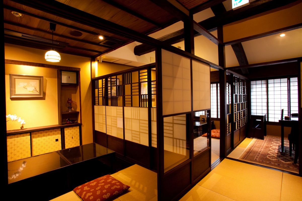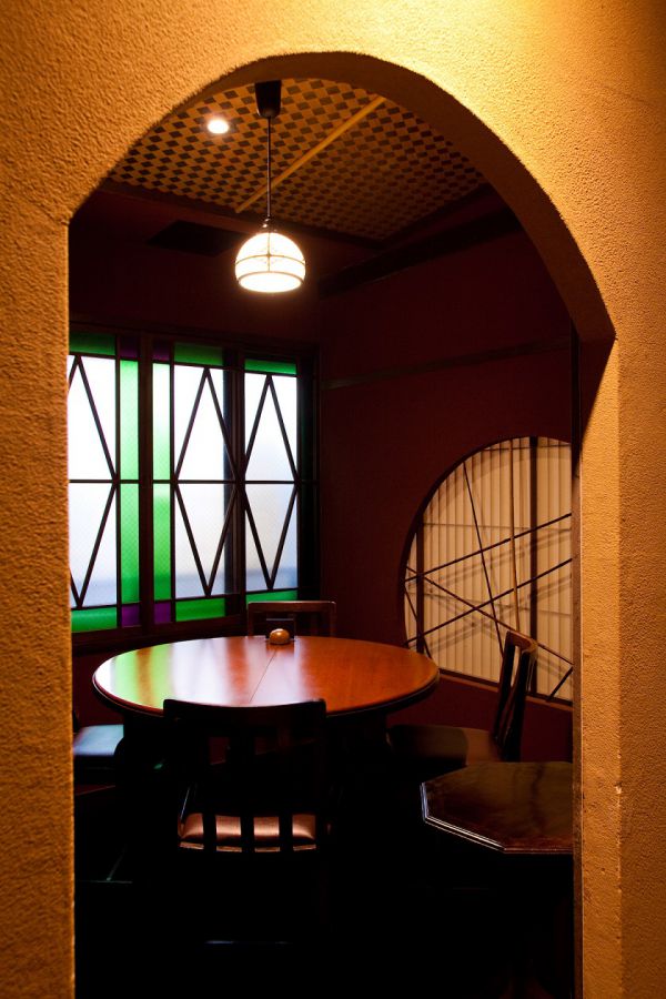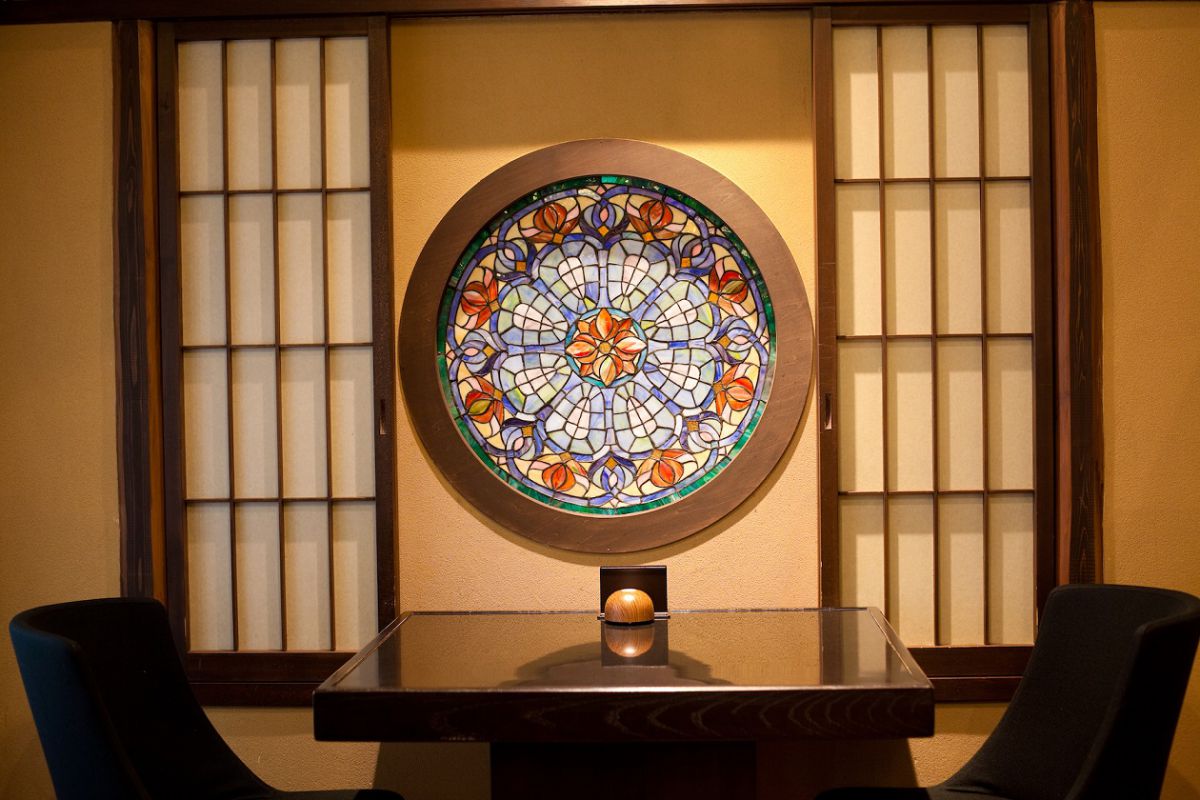 京町家の特徴のひとつ「下地窓」にステンドグラスをはめ込んだモダンな意匠を施したお部屋も。