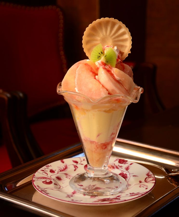 いちごパフェと人気を二分するという桃のパフェは7月中旬(もしくは下旬)〜9月頃にいただけます。旬の桃を生のまま、コンポート、ゼリーと丸々1個使った逸品!何度もリピートしたくなる味わいです。