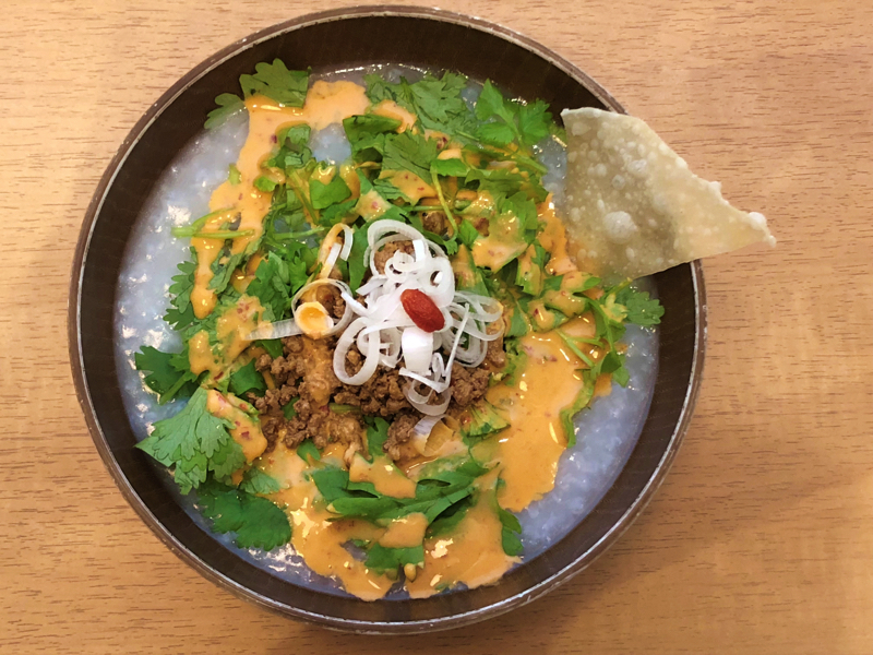 「MOMOGAYUYA」には、ほかにも体に優しいメニューが揃っています。ふわっと広がるパクチーの香りとピリ辛の肉みそがマッチしている「パクチーと肉みそのお粥」(740円)は、クセになる味わいでリピーター続出中。仕上げにかけられるスパイスの効いたソースが、絶妙なバランスで味を引き締めているんです。