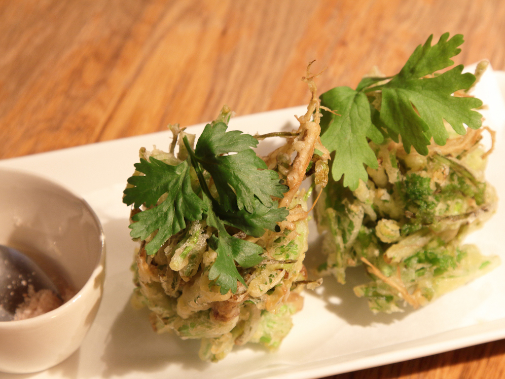 パクチー好きなら必食なのが、数量限定の「パクチーの根っこのかき揚げ」(550円)。パクチー独特の爽やかさが、かき揚げになることでより軽い食感になっています。シソのかき揚げとも違う、パクチーらしい味わい深さが楽しめますよ。