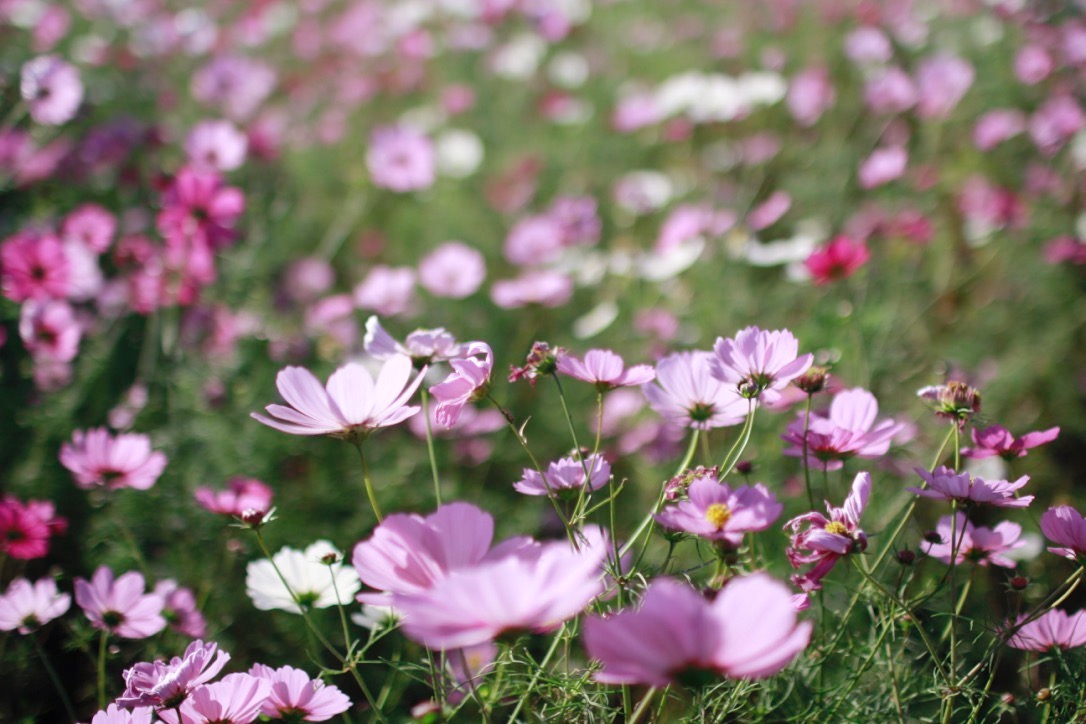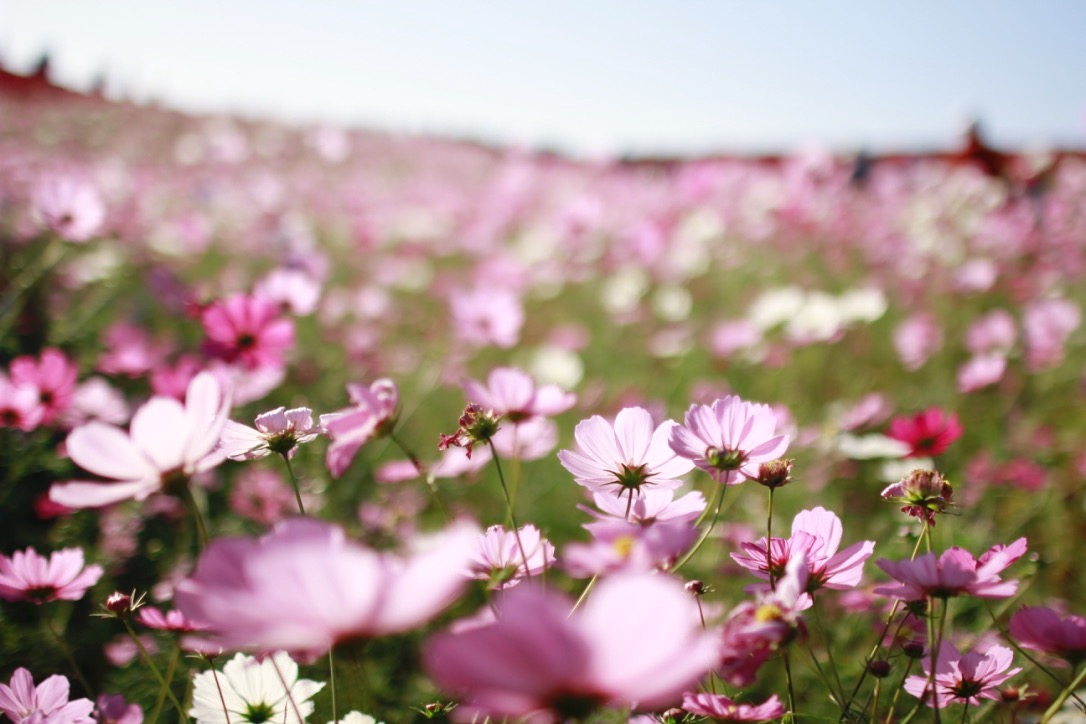 上から見下ろして撮影すると草花しか映らなかったのに、目線を下げて撮影すると空も映り込み、奥行きのある写真を撮ることができました。