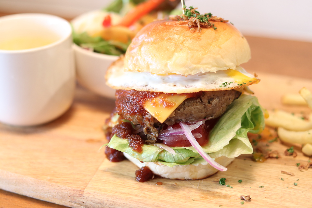 パティはランチメニューのひとつ「おろしそハンバーグ」に使用しているハンバーグと同じもので、ジューシーさ&やわらか食感が自慢。自家製バンズは香ばしく、さくっとした歯切れのよさが魅力です。ガブリ!とほおばれば、パティの肉感と野菜のシャキシャキ感、目玉焼きとチーズのこっくりとしたおいしさが絡まり、口の中が幸せでいっぱいに…!