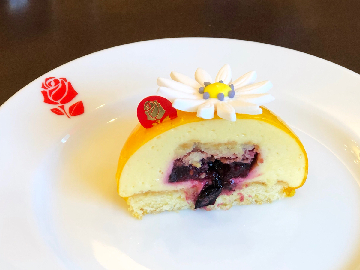ムースのように見えますが、ムースに見立てたケーキ。中のパッションのクリームにはたっぷりのバターが入っていて濃厚。でもパッションの酸味で味がキュッとしまっています。外はパッションのジャム、上にのっている花はパッションフルーツの花をモチーフにしているとのことです。