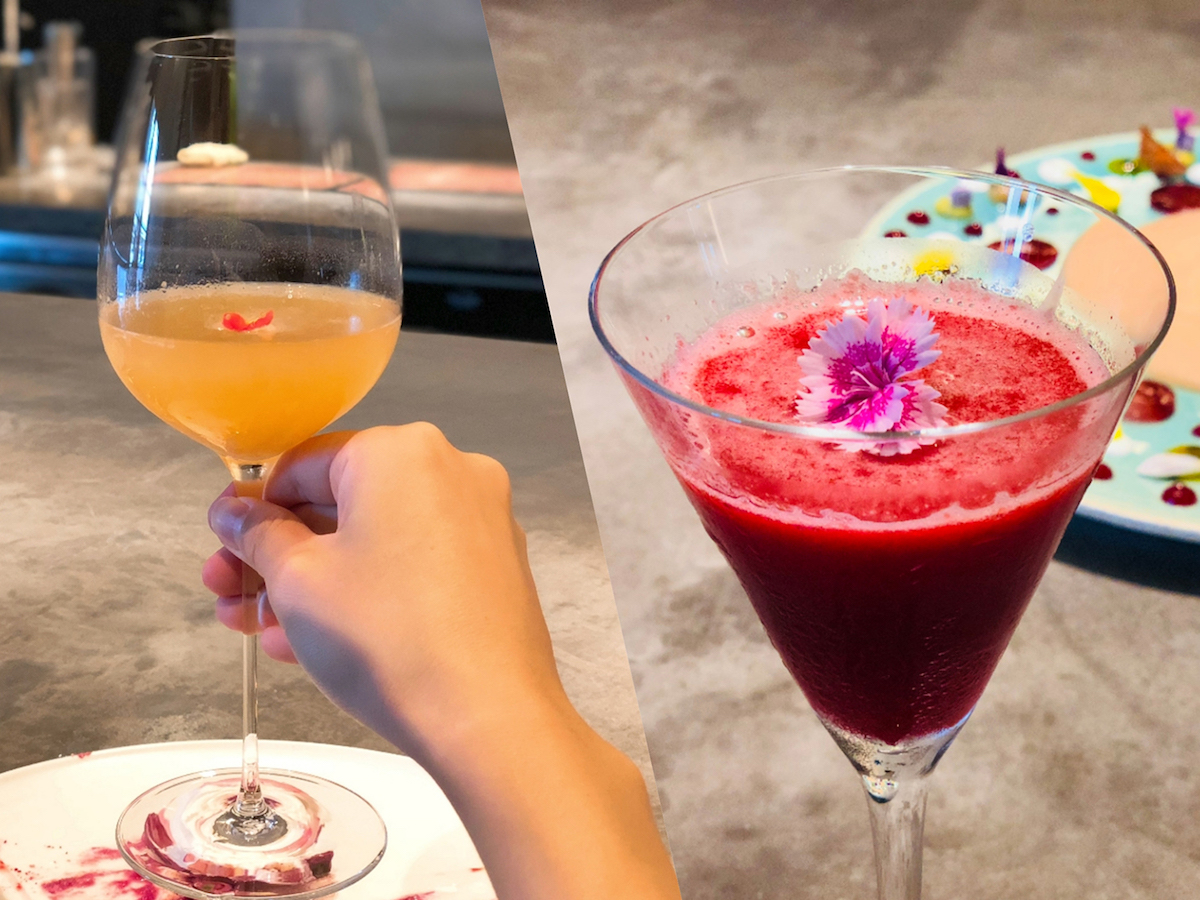 右はノンアルコールの「ロマンティックチェリー」。ノンアルコールカクテルのペアリングもあるので、お酒が飲めない人も安心して堪能できます。