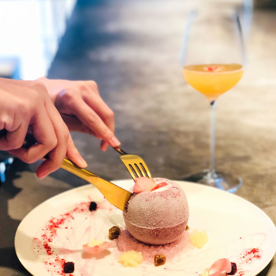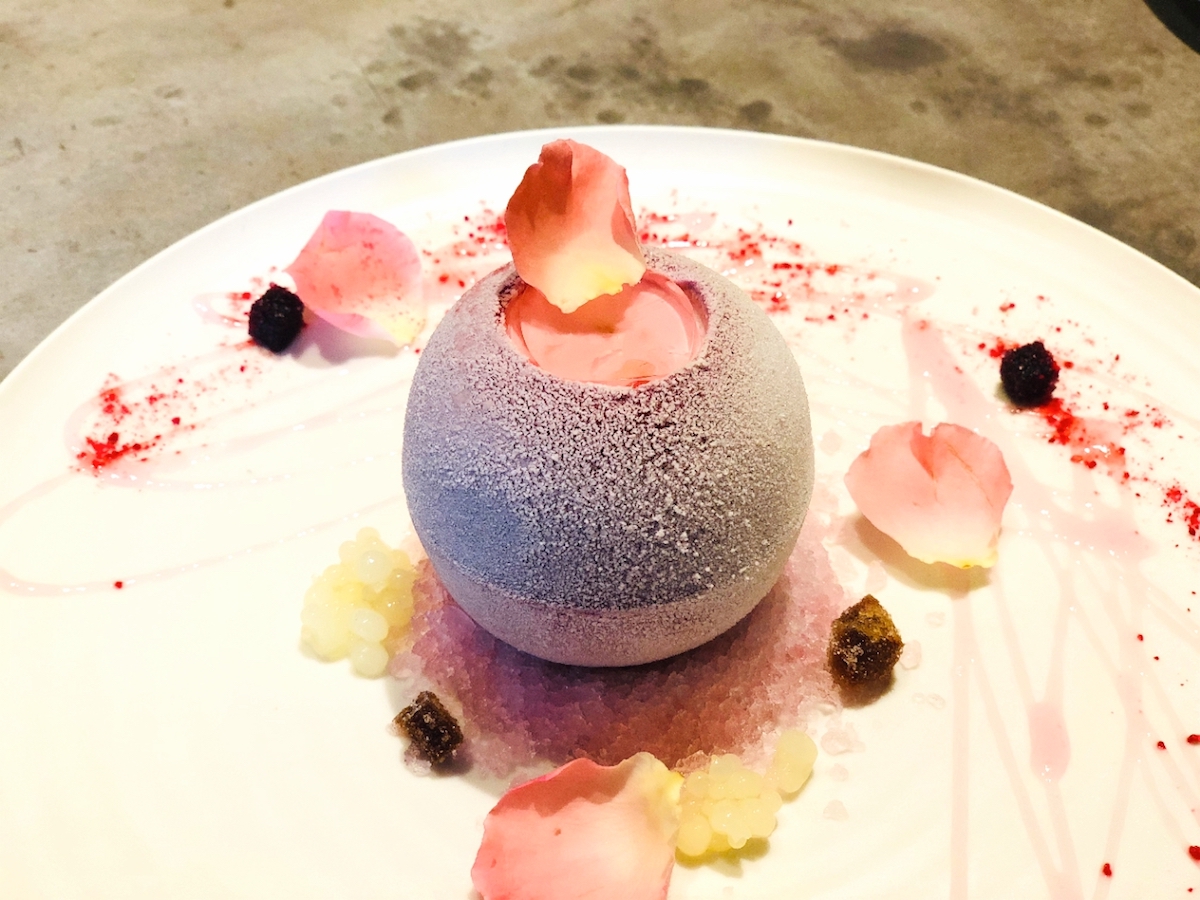 見ているだけでも満足してしまいそうな美しいビジュアルですが、ナイフを入れて口に運ぶと、もっと深い感動の瞬間が訪れます!柔らかなカシスのアイスとボールからあふれ出すふわっふわのエルダーフラワーヨーグルト、プチっと弾ける柚子ゼリー…。それぞれ違った食感に驚くばかり!