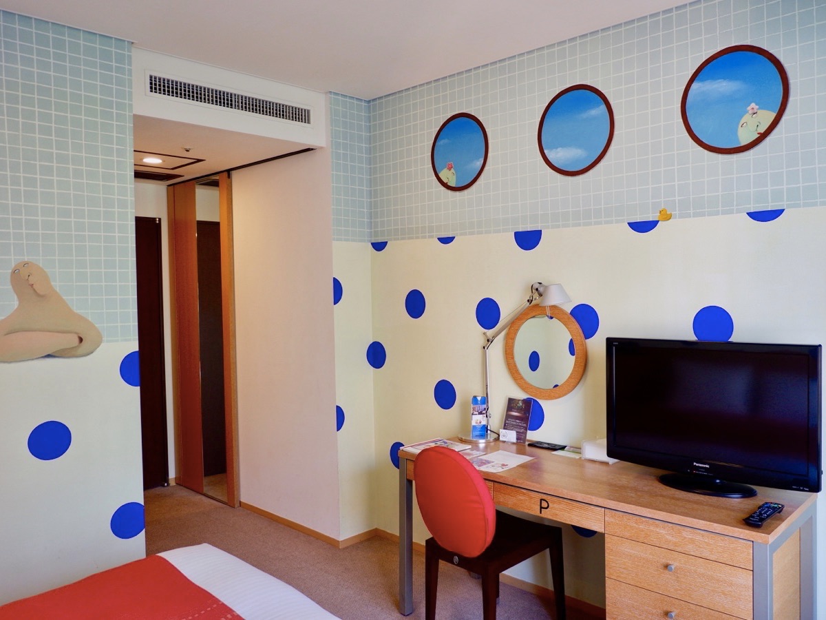 ベッドの反対側はブルーのドットが描かれており、ポップな雰囲気。天井近くには丸窓があり、また別のかわいい「PONI」がこちらを覗いています。
