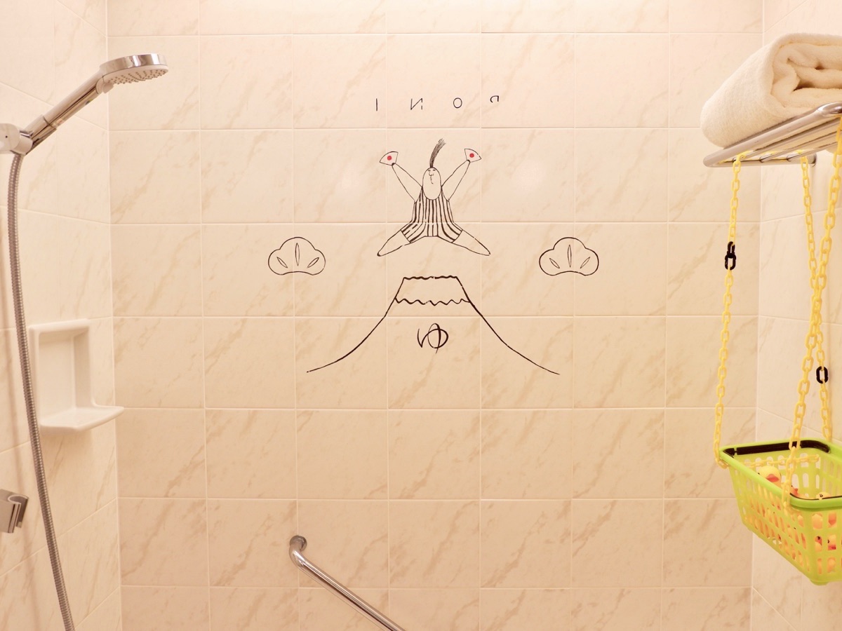 バスルームにも富士山と「PONI」の絵がしっかり描かれていました!さらに本物のあひるのおもちゃまで用意されていて、壁に描かれた銭湯を再現できるような遊び心も散りばめられています。