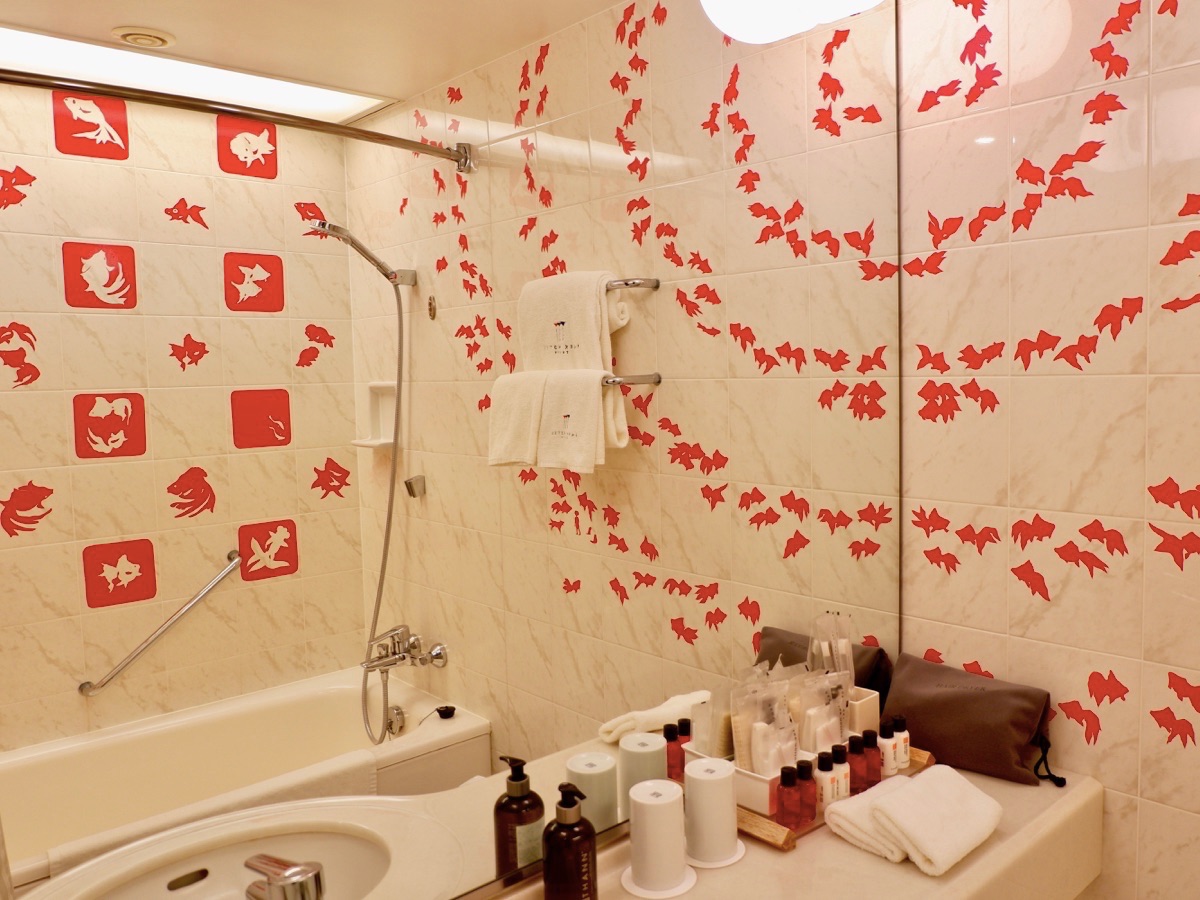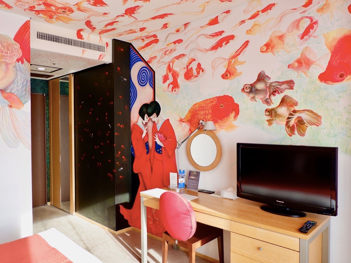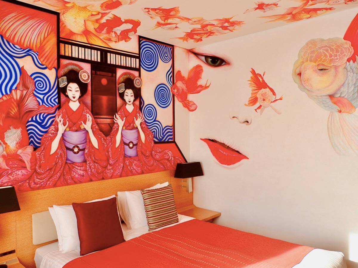 写真の客室は画家・成田朱希さんが手がけたアーティストルーム「芸者金魚」。ベッドサイドに描かれているのは2人の美しい芸妓。客室全体に金魚が泳いでいるかのような幻想的な空間が広がります。