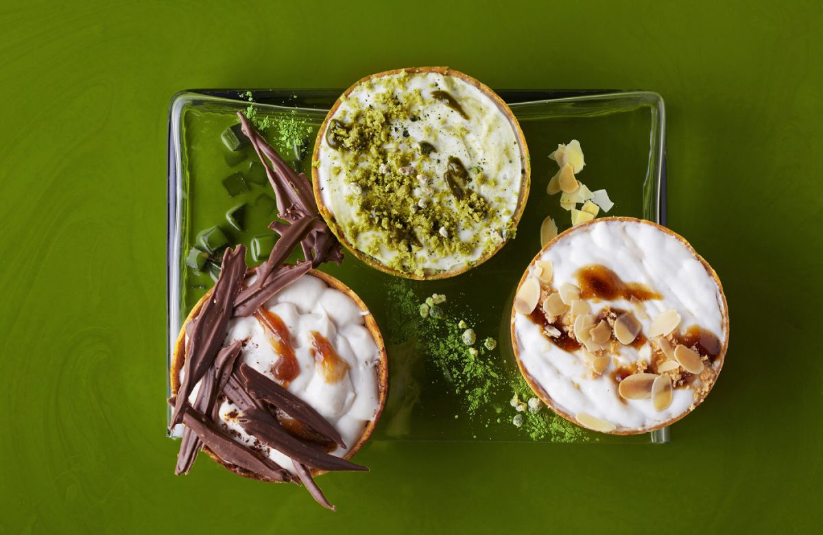 今シーズンのシェフのイチオシは、3種の「茶葉ラテタルトのセレクション」。タルト生地の上に、ダマンド生地(焼いたアーモンドクリーム)を重ね、さらに抹茶・ほうじ茶・アールグレイのジュレ状のジャムを敷き、ふんわり食感のミルクムースコーティング。ラテ感覚で3種の茶葉の香りの違いを楽しめるシェフ渾身の一品です。
