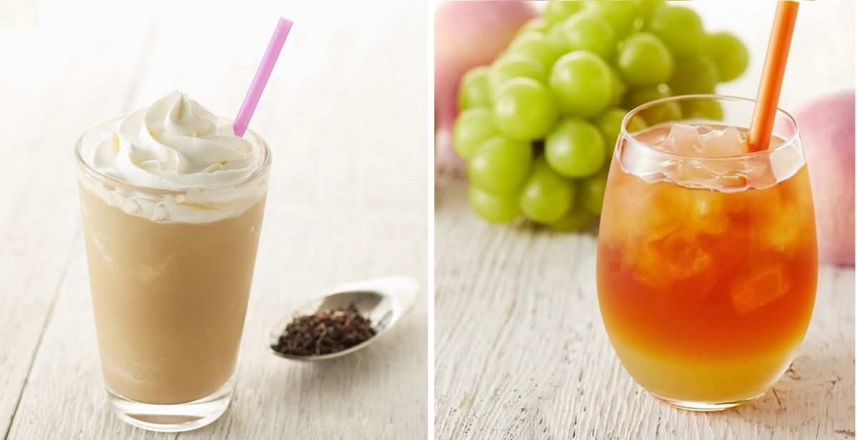 このほか、(左) 「ロイヤルミルクティークリームスワークル®(FROZEN)」Short 490円・Tal 540円・Grande 590円と、(右)「&TEA ピーチ&マスカットティー(ICEDのみ)」Tall 500円・Grande 550円も同時発売します。