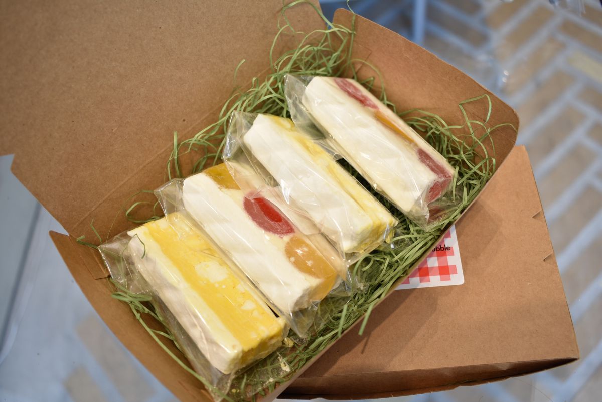 おいしそうでかわいい商品ばかりが並ぶ店内で発見したのは、ボックスに詰められたフルーツサンドとたまごサンド。なんと、このサンドイッチは全てスイーツで作られた「スイーツ弁当」なんです。