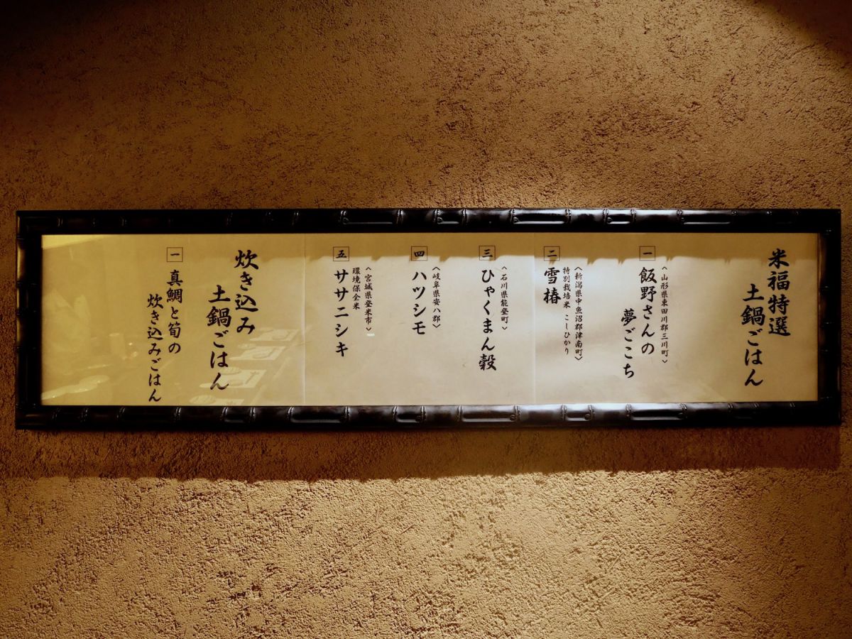 こちらのお店では、「米福特選 土鍋ごはん」として、常時5種類のお米をラインナップ。