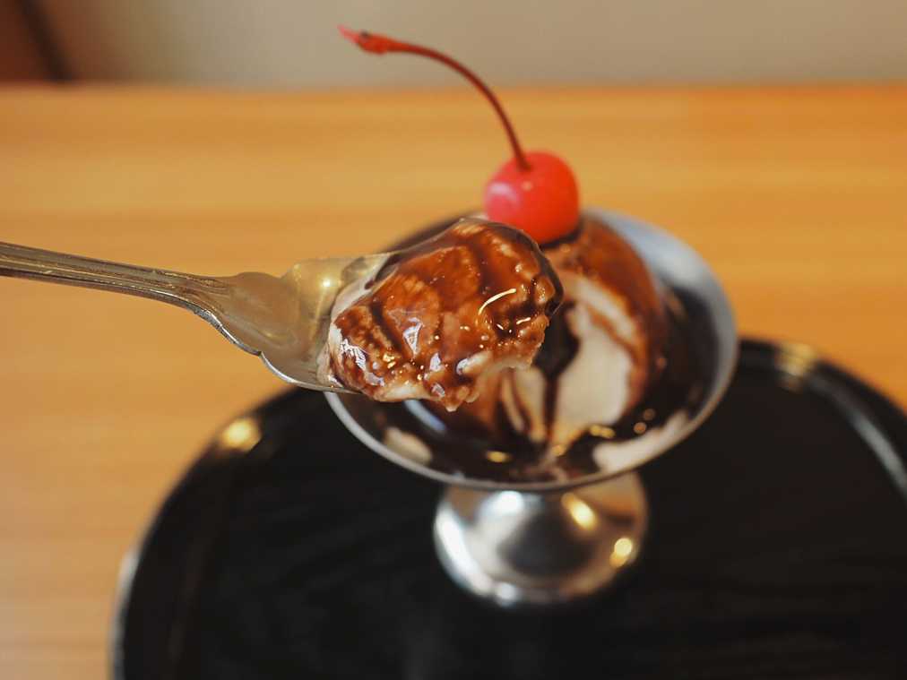 さて、こちらがそんな「芋甚」でいただける「チョコレートサンデー」(340円)です。レトロな銀の器にコロンと盛られたバニラアイスに、たっぷりかかったチョコソース、そしてちょこんと乗ったチェリーがとにかくかわいい1品です!そのシンプルなたたずまいが、むしろ印象的。