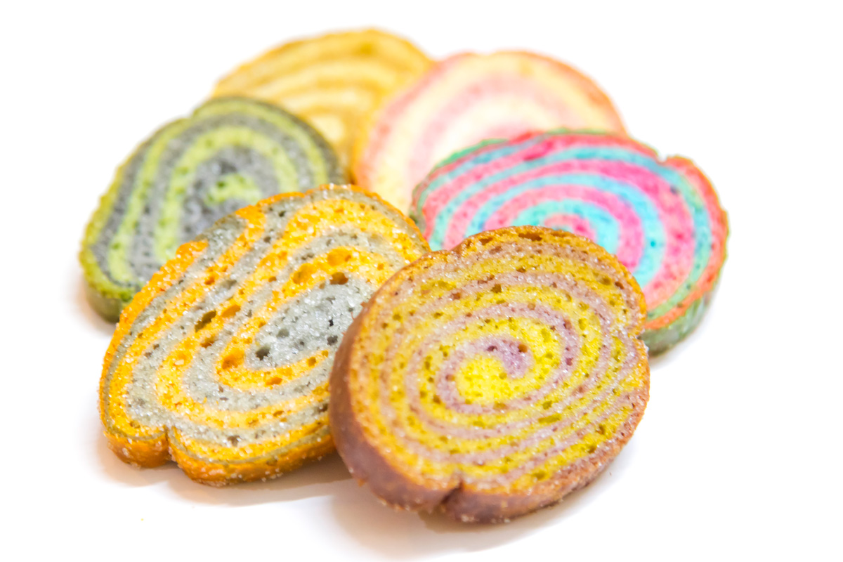 写真は渦ラスク6種。手前から時計回りに、すいーとぽてと(紫イモ&ハチミツ)、きんぴらごぼう(ゴボウ&ニンジン)、抹茶あんみつ、キャラメルラテ、ベリーショートケーキ、フルーツサラダ(青りんご&サクランボ)です。