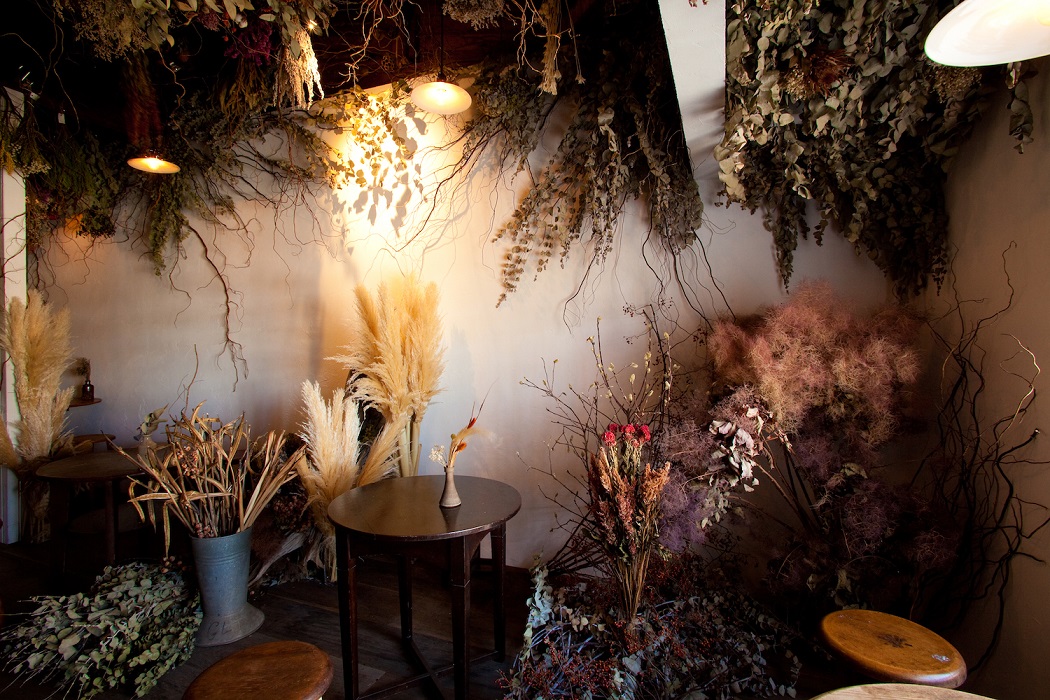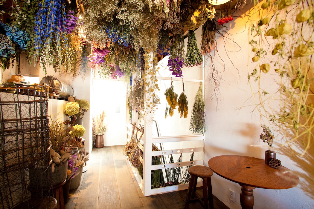 一歩足を踏み入れると、出迎えてくれるのは、ドライフラワーの花天井。