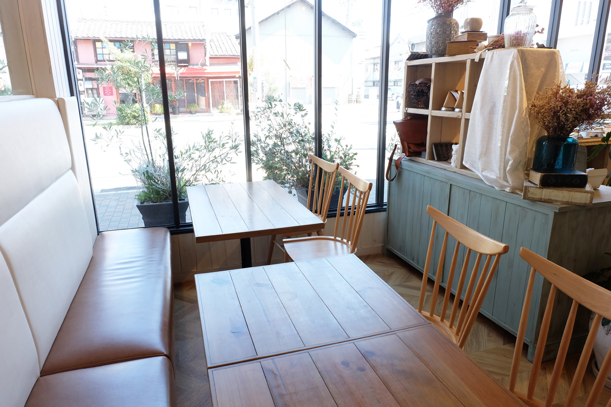 店内奥にはイートイン席も完備。テイクアウトはもちろんですが、ここでタルトを楽しむことができるのも人気の秘密!大きな窓からは明るい日差しも降り注ぎ、開放感も抜群です。