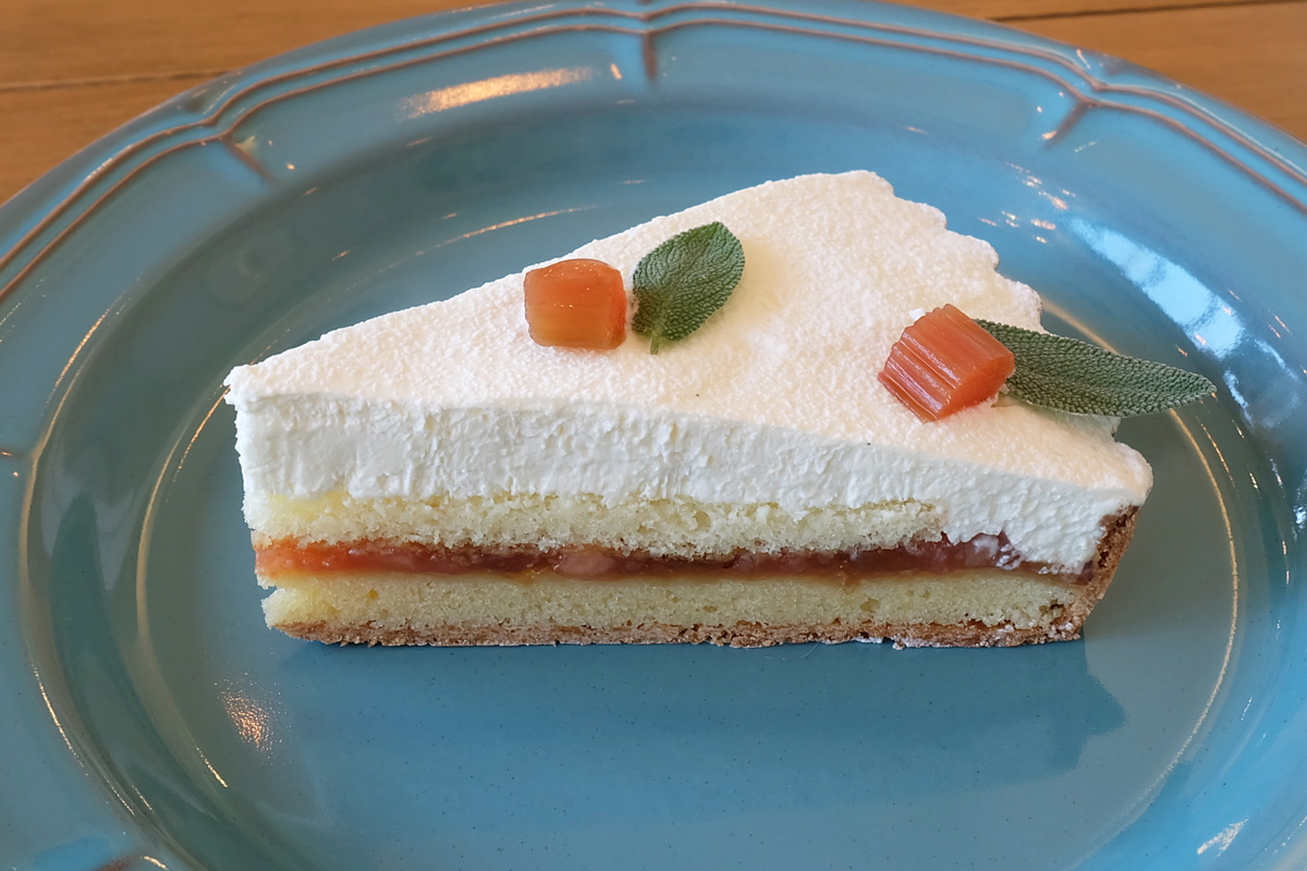 リュバーブ、りんご、フロマージュブランをバランスよく合わせた「リュバーブのミ・コンフィ セージの香りで」(648円)。カスタードクリームを合わせることで、コクがありながらさっぱりとした味わいが魅力的です。
