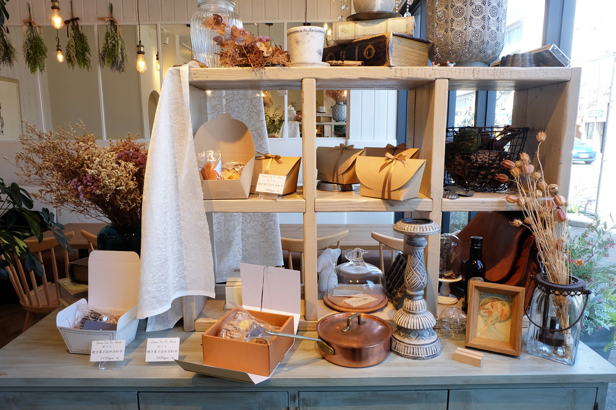 扉を開けると、アンティークな雰囲気の店内が広がります。ドライフラワー、可愛らしい照明や、アンティーク調のテーブルまで乙女心をくすぐる空間です。