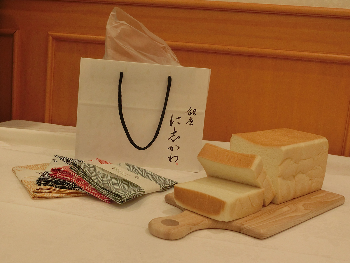 「食パン」は税抜き800円。銀座の料亭のおもたせをイメージする手提げ袋で、“プチ贅沢”“自分へのご褒美”“気の利いた手土産”にぴったり。アツアツのパンの蒸気がこもらないように、上が開くタイプの保存袋を使っていたり、手提げ袋の底は型崩れしないようにしてあったりと、細かい気配りされているのもうれしいですね。食パンを包む専用のオリジナル風呂敷もあるからお店でチェックしてみては。