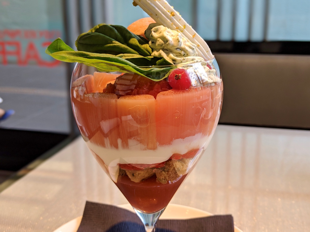 また、ルバーブは、赤い梅干しのような酸味で、繊維がたっぷりの野菜。あまり日本では馴染みがありませんが、欧米では煮て調理し、よく食べられているそうです。色鮮やかでパフェをより一層華やかにしてくれます。