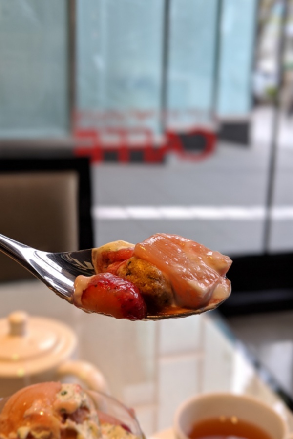 口にいれるとサクサク、シャキシャキ。一度で色々な食感が味わえて食べる楽しさを感じました。コンポートされたルバーブの酸味とストロベリーの甘みをフロマージュブランクリームがまろやかに包んでいて、上品でやさしい味。