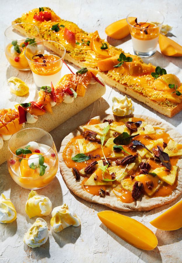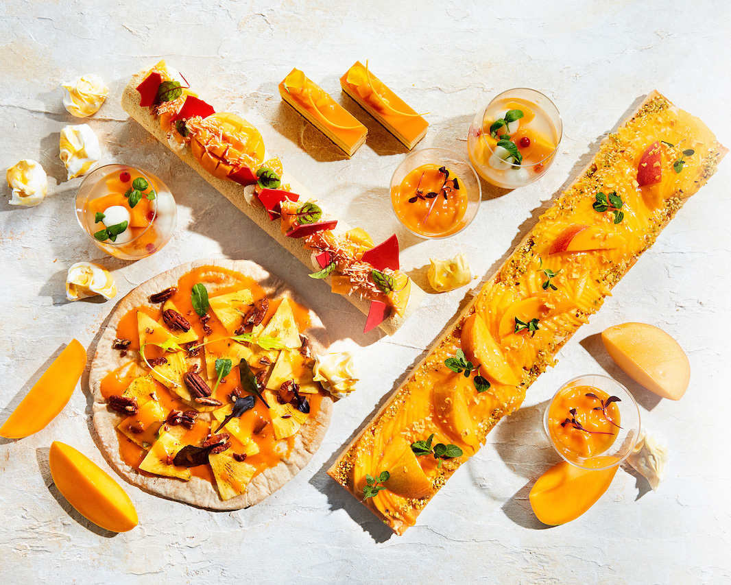 気になるビュッフェメニューは約35種類。ペストリーシェフ近藤大介氏が得意とする美しいグラススイーツは「ココナッツムースとマンゴージュレ」、「バジルの香るマンゴーコンポートとソーダ」。スペシャリテの「マンゴーオペラ」、果肉の甘み・チーズの塩気・煎ったナッツの香ばしさが一体となった「マンゴーとパインと蜂蜜のピッツァ」など、想像をかきたてられるメニューばかりです。