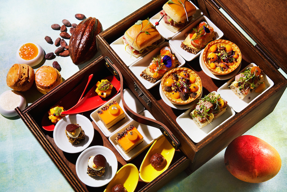 スーツケースをイメージしたアフタヌーンティーボックスの中に、マンゴーとカカオのコンビネーションが新鮮なスイーツやカナッペが並びます。