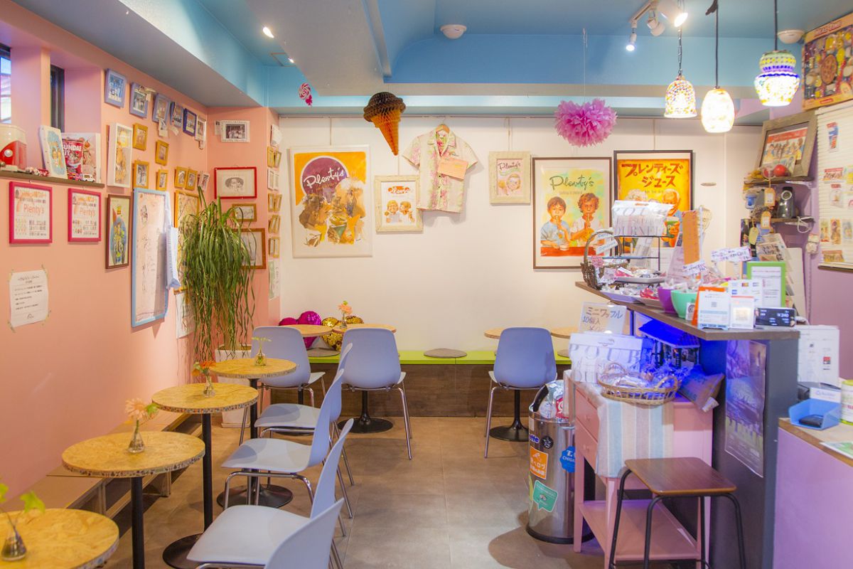 ピンクの壁やブルーの天井など、パステルカラーがとってもキュート。アメリカンポップなポスターやレトロなおもちゃが飾られて、賑やかな雰囲気です。