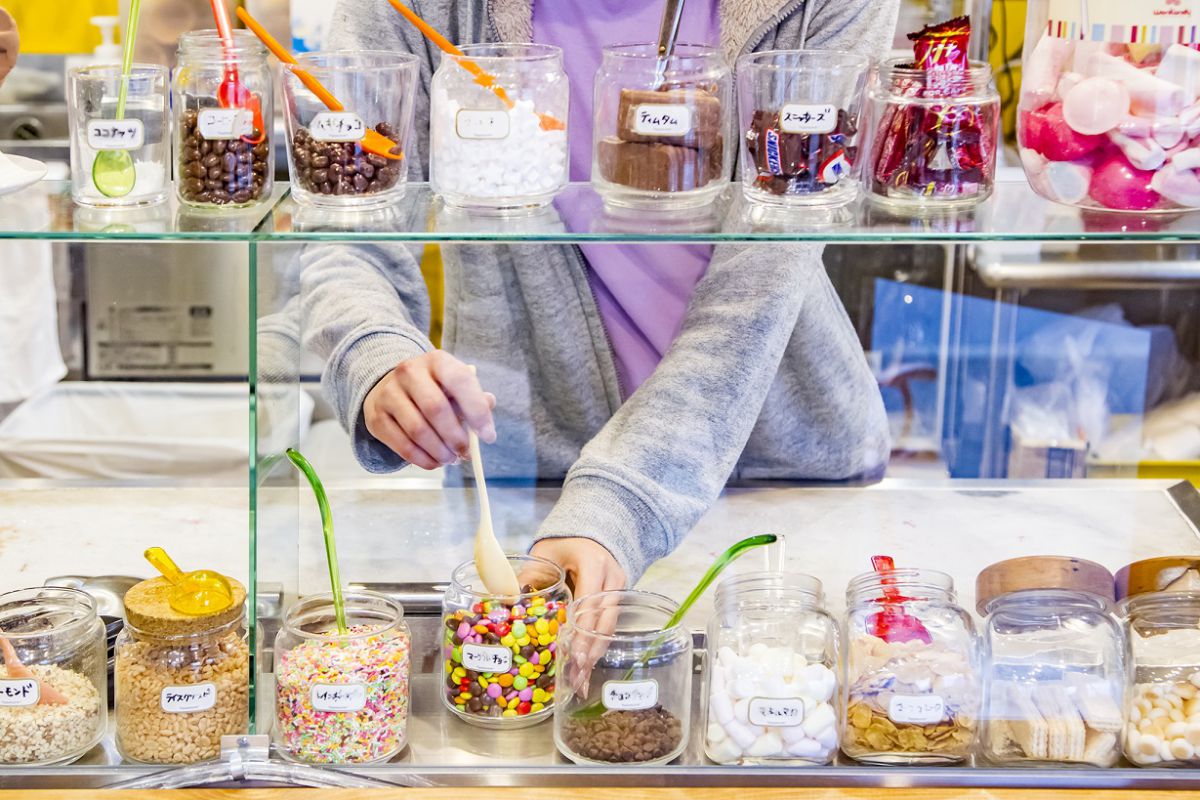 好きなアイスを1つ、トッピングを2種選び、その場でミックスしてくれるんです。トッピングはいちごやブルーベリー、バナナ、ビスケット、ナタデココ、チョコクッキー、あずき、きなこ、黒みつなどなど、30種以上も!