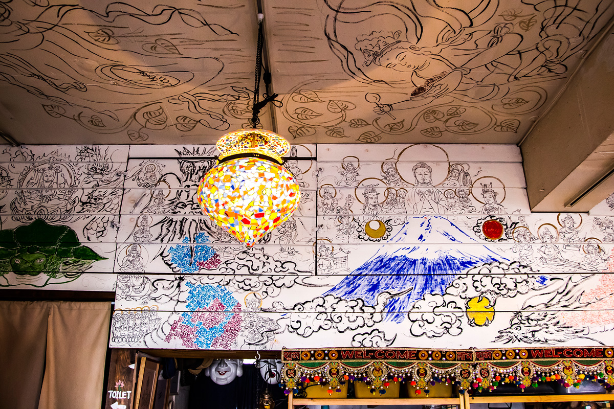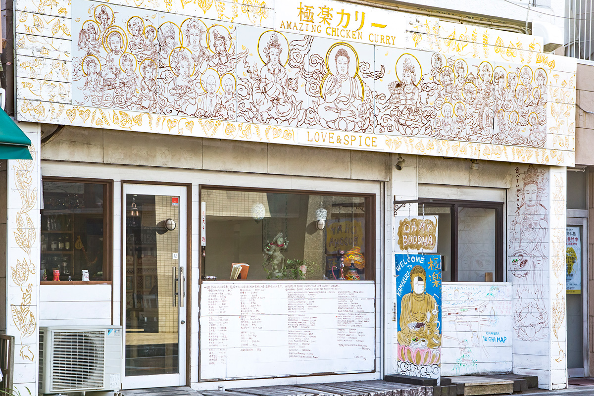 鎌倉駅から長谷駅を結ぶ由比ヶ浜通り。通り沿いにはおしゃれなカフェや雑貨店が点在しているので、ぶらぶら歩くのが楽しいエリアです。大仏様に観音様?白い壁にイラストや文字が細かくびっしりと描かれていて、異彩を放っているのが「極楽カリー」です。
