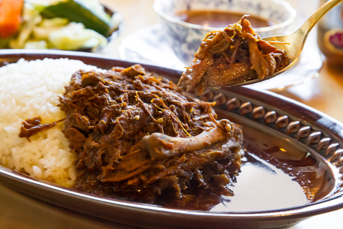北インドカレーをベースにしながら、鶏ガラや豚の骨などで丁寧に取った出汁や醤油で味付けすることで、日本人好みの味わいを実現。素材の旨みがぎゅっと凝縮されたルーに、ご飯が進んで止まらない…!