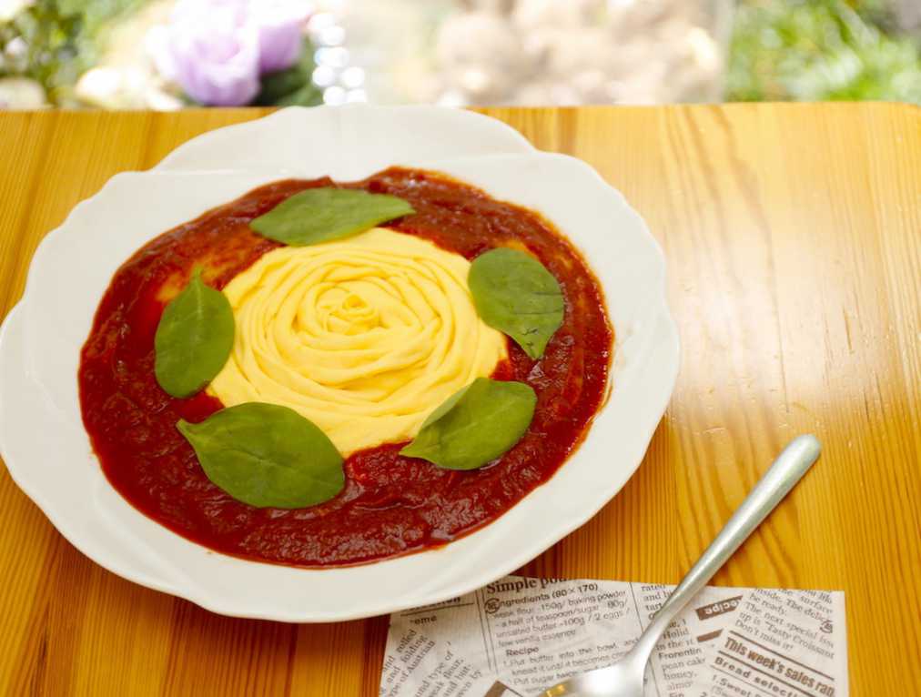 「Cafe tint」のオーダーメイドオムライスはこのお店の看板メニュー。卵の形とソースを選んで自分好みのオムライスにアレンジできるんです。写真は卵の形をバラに、ソースをトマトモッツァレラにした人気の組み合わせ。卵の形はバラのほかに、猫・うさぎなどのアニマル形やドレスタイプなど約10種類、ソースはクリームチーズやアボカドなど約19種類からそれぞれ選べます。