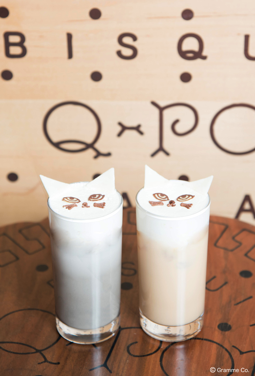 フルーツの華やかな香りをブレンドしたQ-pot CAFE.オリジナル紅茶フラワーガーデンをベースにしたティーラテ各750円(税込)。ほろ苦く甘さ控えめな大人の味わいの塩キャラメルフレーバーと、ヘーゼルナッツシロップが隠し味の黒ゴマフレーバーの2匹の“ネコ”から選べます。
