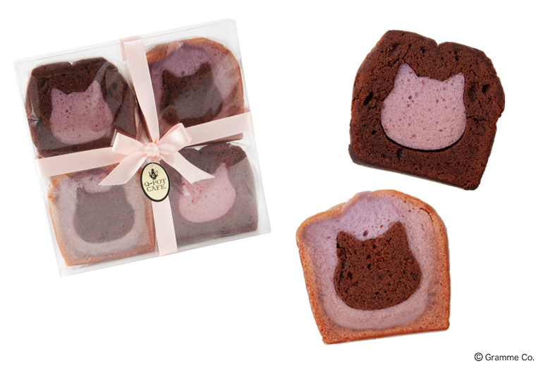 おみやげにネコモチーフのパウンドケーキはいかが?ツインキャットパウンドケーキパープルキャット/ブラウンキャットは単品 各300円(+税)/ 2個入り800円(+税)/ 4個入り 1500円(+税)。4個入りはリボンもかけてあるので、そのまま渡せてちょっとしたプレゼントにもおすすめです。