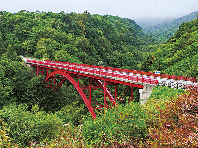 清里の山あいを走っていると目に飛び込んでくるのが、川俣川渓谷に架かる赤いアーチ橋。鮮やかな赤が新緑に映える印象的な風景は、切りとって飾りたくなる1コマです。紅葉の時期も絶景が見られておすすめ。橋のたもとの駐車場にある展望台は、橋の全景が眺めることができるビュースポットです。
