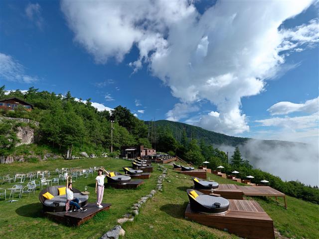 冬はスキー場、初夏から秋にかけては絶景を望むテラスになる「サンメドウズ清里ハイランドパーク」。麓のレストランで高原野菜たっぷりのビュッフェを楽しんだあとは、標高1900mの「清里テラス」へ。テラスから望む青空と緑、清里高原のパノラマビューは圧巻の一言。ベンチにゴロリと寝転んで、天空の絶景をひとりじめしてしまいましょう。