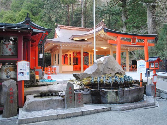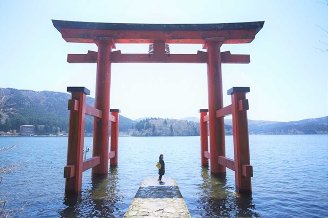 「箱根神社」の隣に建つ「九頭龍神社新宮」は、縁結びで知られるパワースポット。新宮前には霊水である龍神水が沸いていて、縁結びに効くとのこと。その場で飲むことも、持ち帰ることもできるので、ぜひパワーをいただいていきましょう。芦ノ湖畔に建つ鳥居「平和の鳥居」も見どころのひとつ。湖に浮かぶ鳥居の姿は美しく神秘的です。