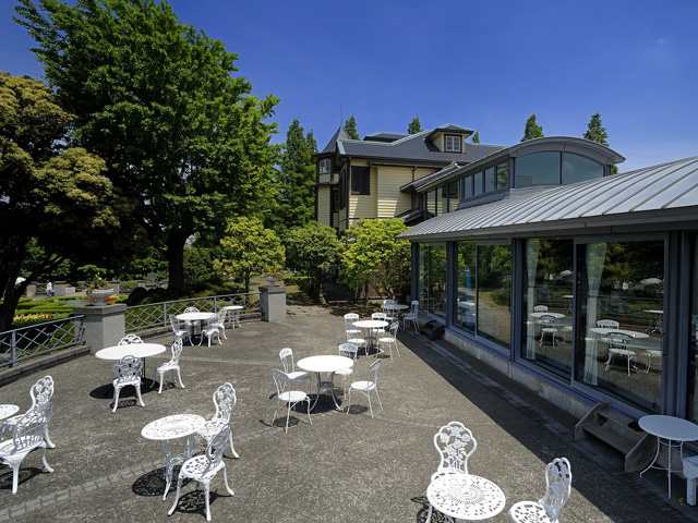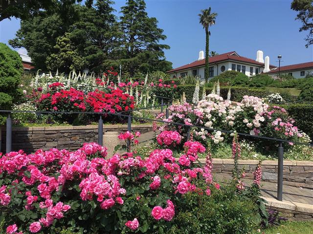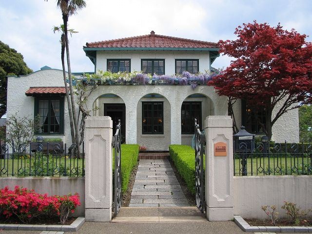 大正15年(1926)に建てられたスパニッシュスタイルの洋館は、赤い瓦屋根と白壁のコントラストがおしゃれ。前庭は芝生になっていて、玄関前の三連アーチに緑がよく映えます。建物の裏手に広がるバラ園ものぞいてみましょう。
