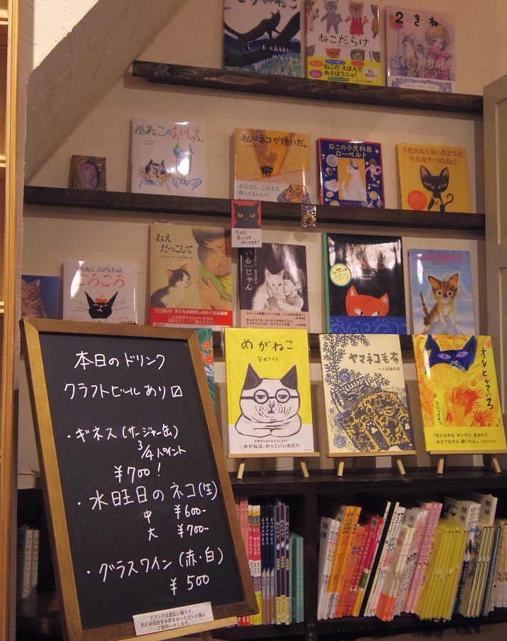 1階にはテーブルが、2階には座卓があるので、ビールやワインは好きな席でどうぞ。猫本に囲まれて、好きなだけ猫と本について語り合うことができます。
