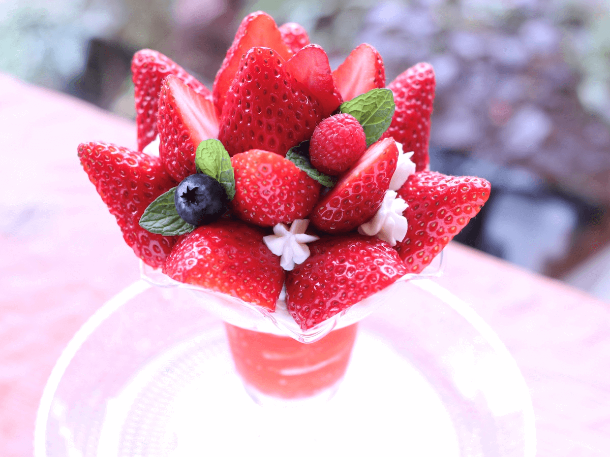 フルーツ屋さんのフレッシュいちごがてんこ盛り!キラキラのビジュアル系パフェ