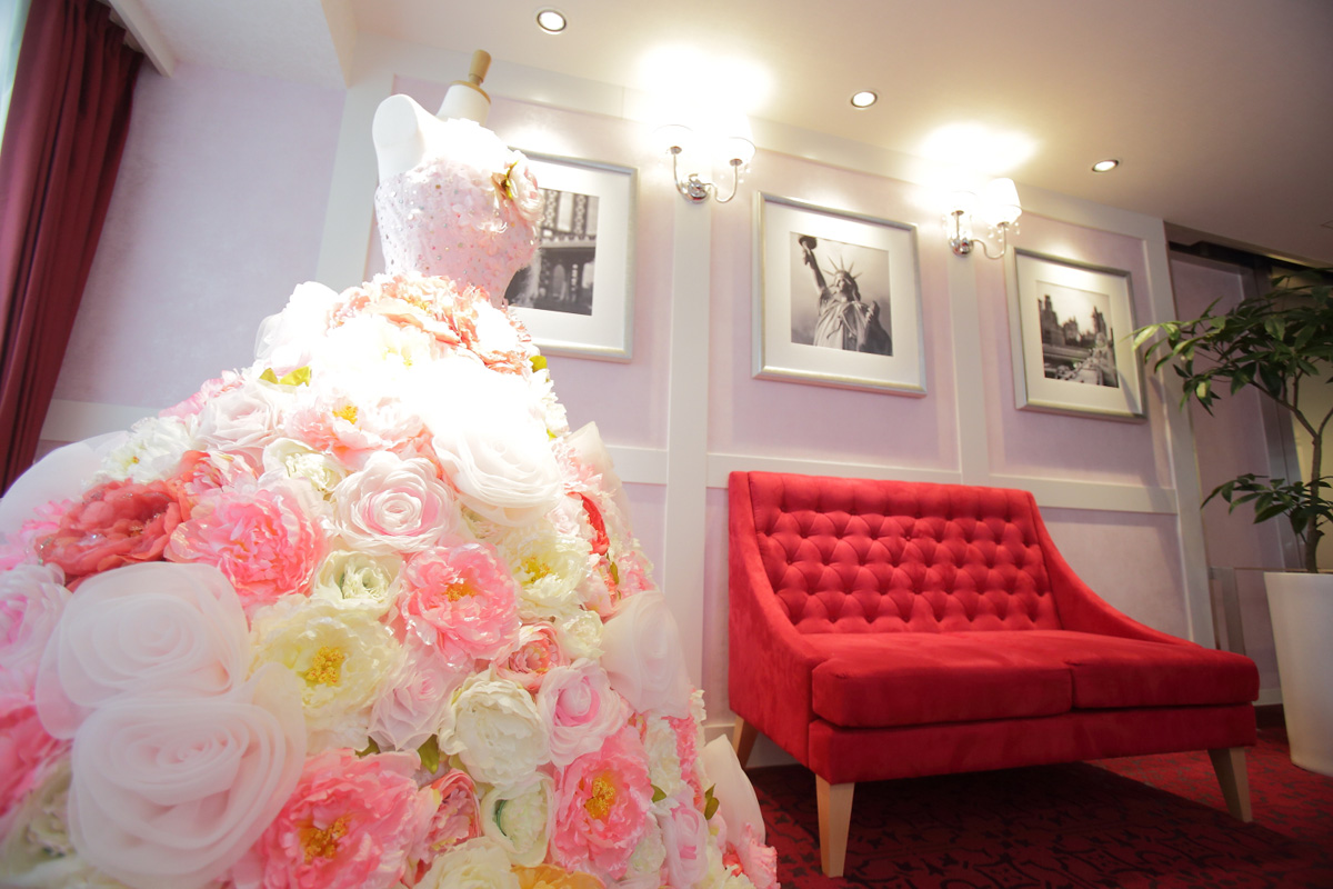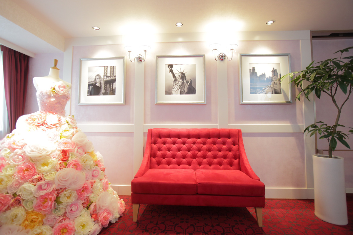 扉が開くと、フラワードレスと赤いソファがお出迎え。部屋に向かう前に撮影タイムです。ちなみに14階は女性限定のフロア。残念ながらカップルの利用は不可。女性同伴であっても男性は宿泊できないフロアなのです。