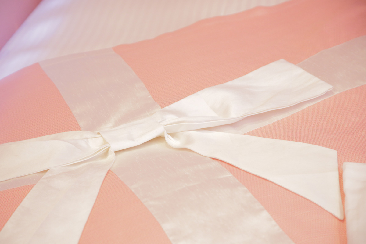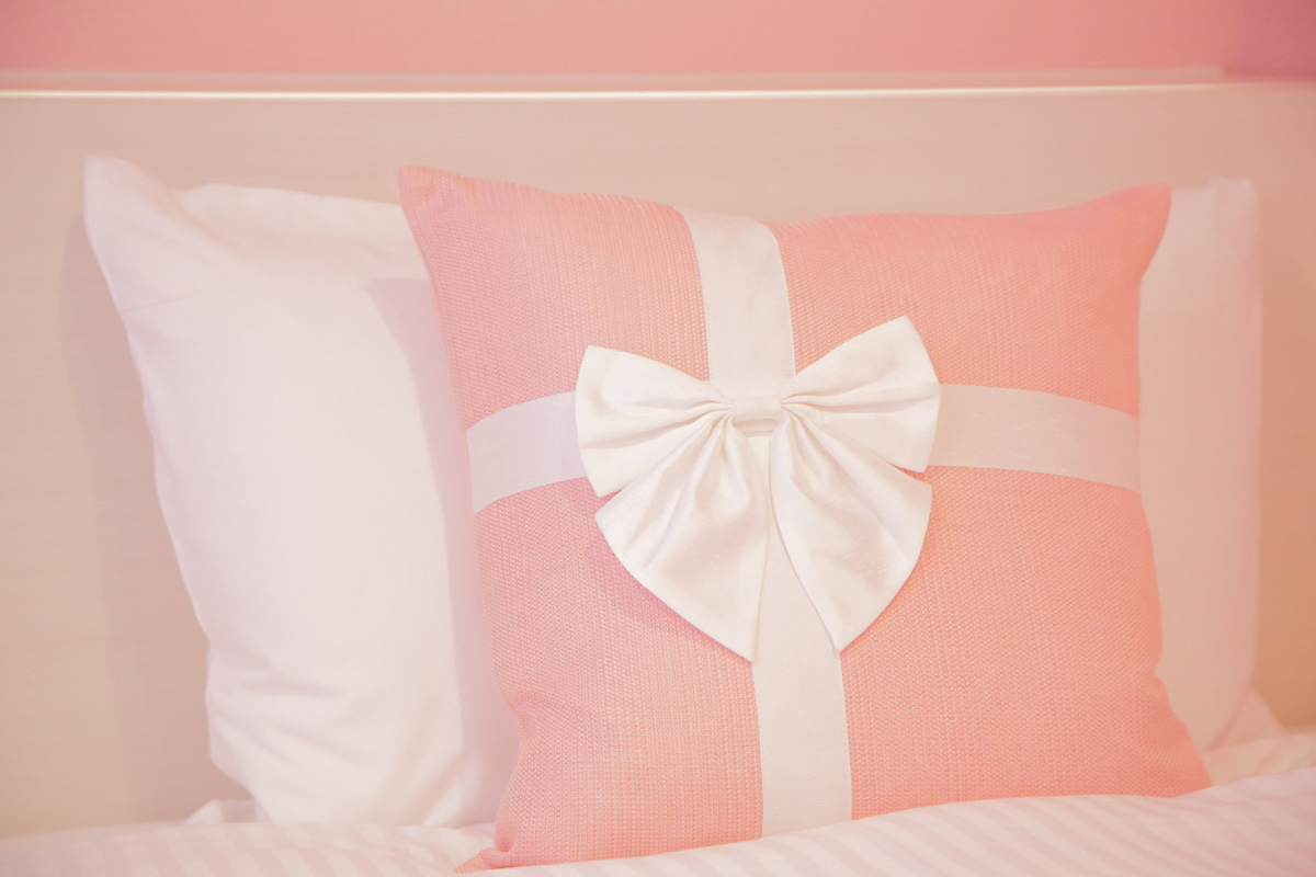 枕元にもピンクのクッション×リボン。夢見心地…。