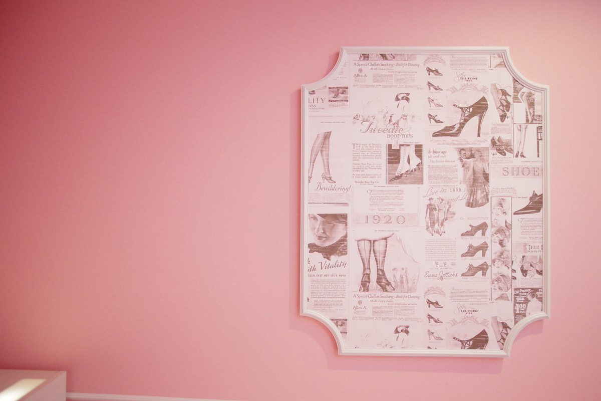 どこを向いてもピンクの壁!モノクロアートが際立ちます。