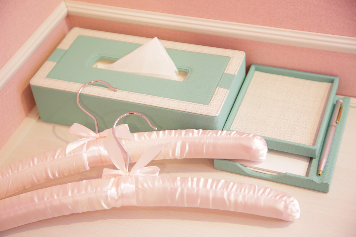 ハンガーだってピンク色。ティッシュボックスやダストボックスなどの備品はホテルオリジナルデザインのもの。ティファニーブルーが差し色となっています。