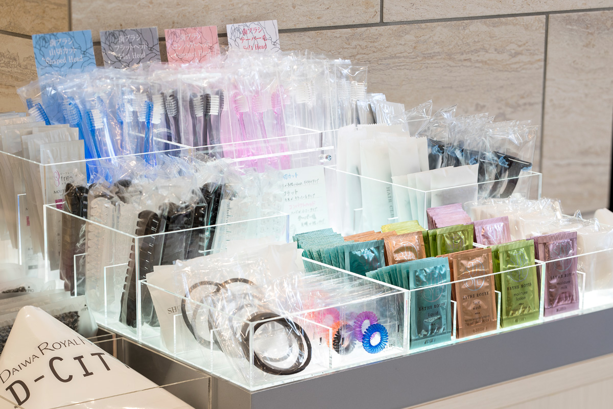 かわいさの追求だけでなく、快適に過ごせるこだわりも随所に光ります。例えば、アメニティは数種類から好みのものをセレクトできるバイキングスタイル。