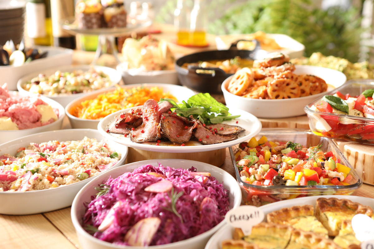 野菜たっぷりのデリ、サラダ、デトックスウォーターなど、美容と健康を意識したメニューがずらり。アメリカフェの朝食ブッフェが食べられるのはここだけ!