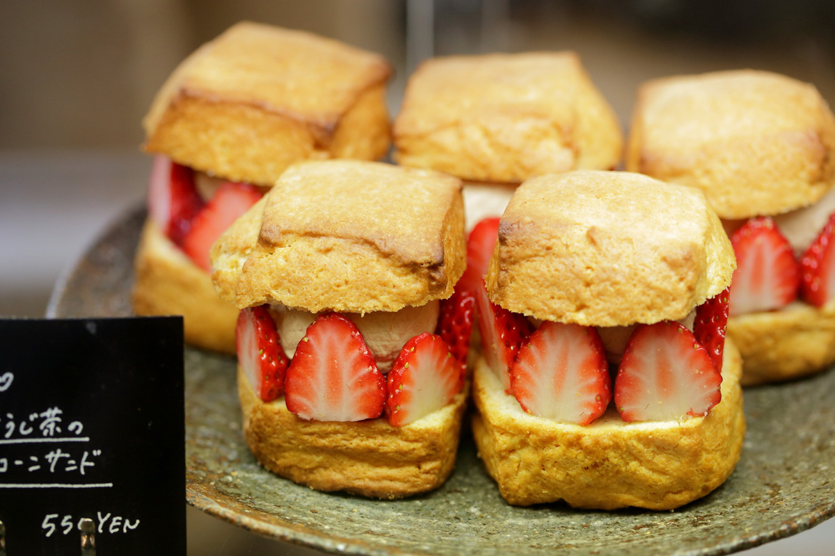 ベストセラーは国産小麦粉を使った「スコーンサンド」(550円)。外はサクッ、中はふんわりとした食感がクセになります。写真の「いちごとほうじ茶のスコーンサンド」は3~4月の人気メニュー。季節ごとに内容が替わるのが、KANNON COFFEEのスイーツの特徴です。
