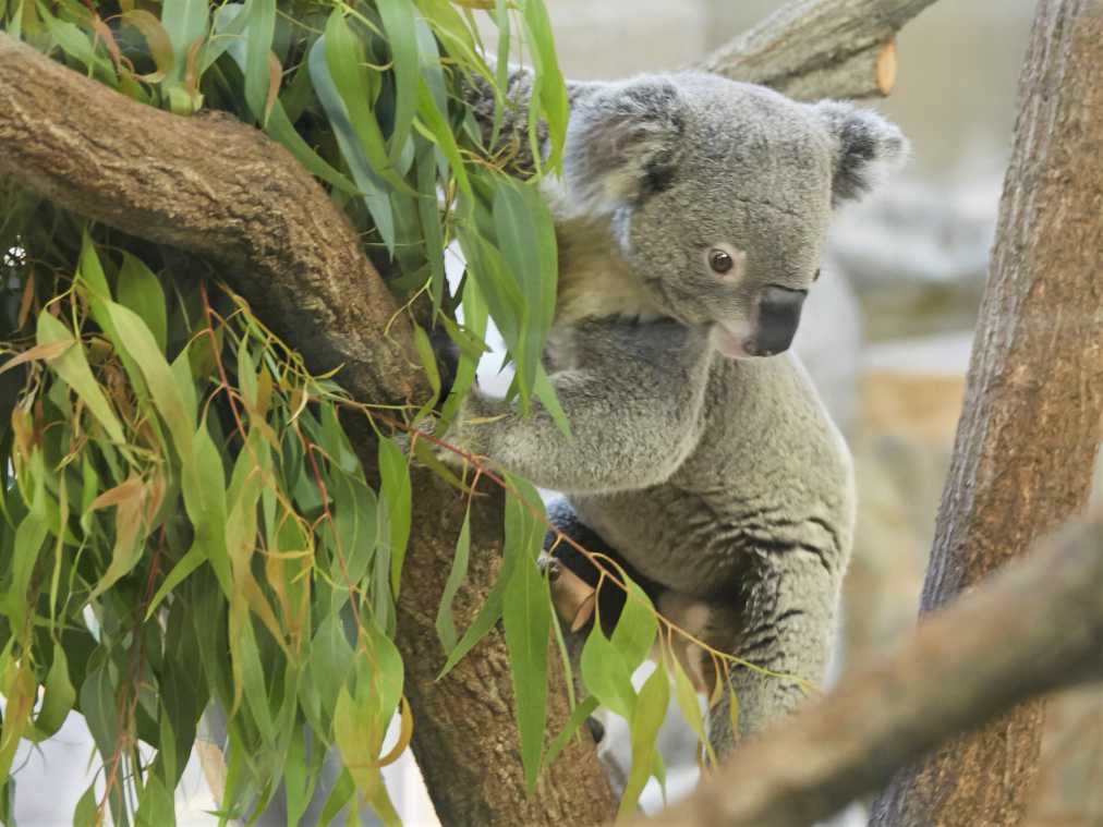 止まり木から後ろ向きに下りてくる姿もとってもキュート!新鮮なユーカリを求めて小走りでタッタッタ!金沢動物園では、開園中にユーカリを交換するのは1回だけ。このチャンスを逃すまいと止まり木から降りてきくる元気な姿が見られます。