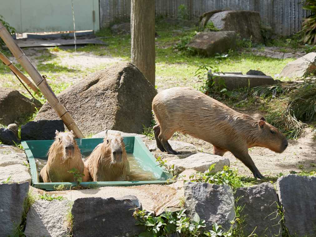 インドゾウのダイナミックさとは対照的に、こちらは打たせ湯でほんわかと。2017年冬に金沢動物園にやってきた3頭のカピバラの入浴シーンに癒されます!「カピバラのほんわか湯たせ湯」は毎日14時30 分から15時まで。