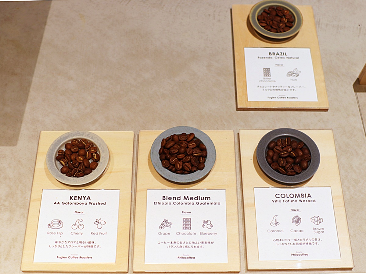 コーヒー豆は渋谷区富ヶ谷の「FUGLEN COFFEE ROASTERS」、千葉県船橋市の「PHILOCOFFEA」さんという人気のロースターから仕入れたもの。焙煎度はもちろんコーヒーの産地や特徴などの説明があるので、選ぶときの参考になりそうです。